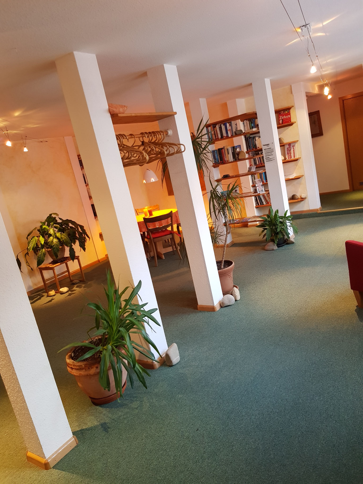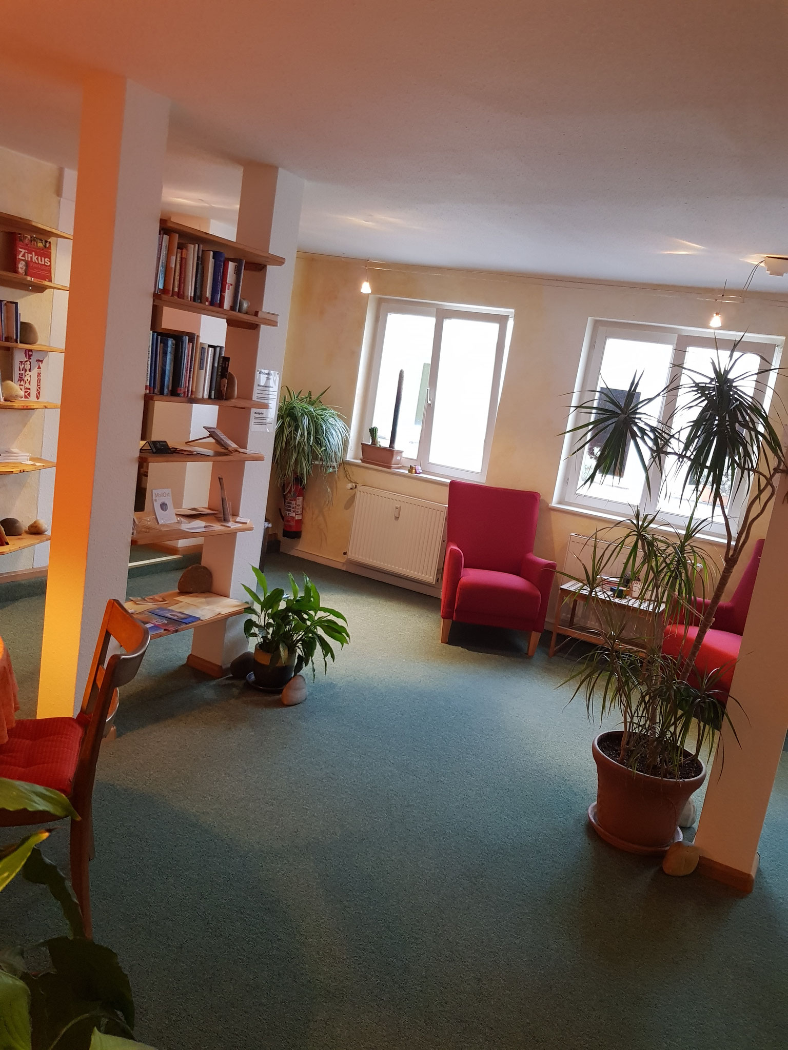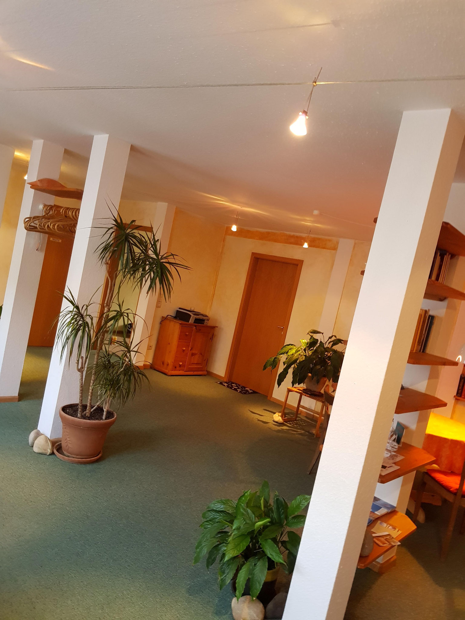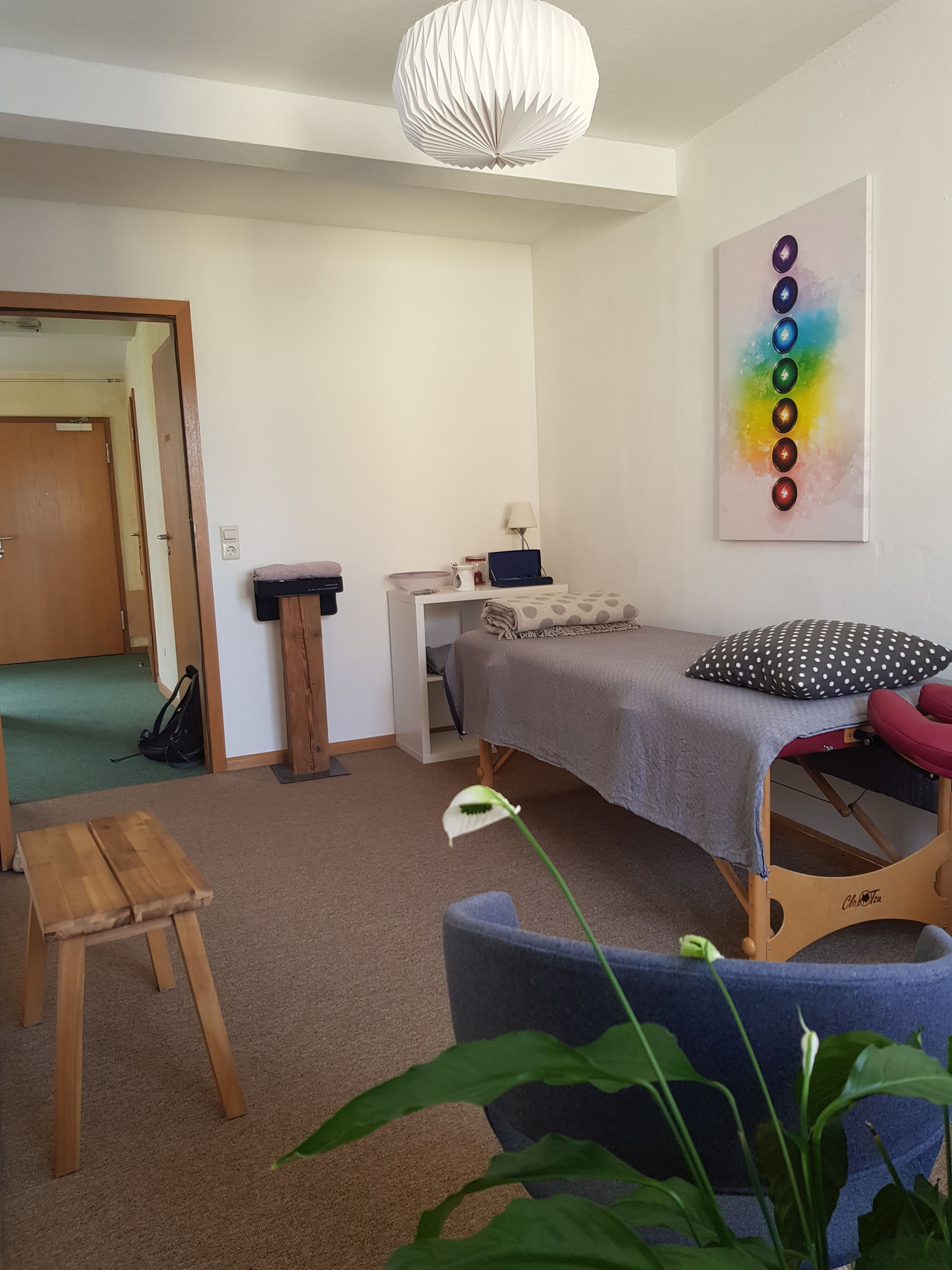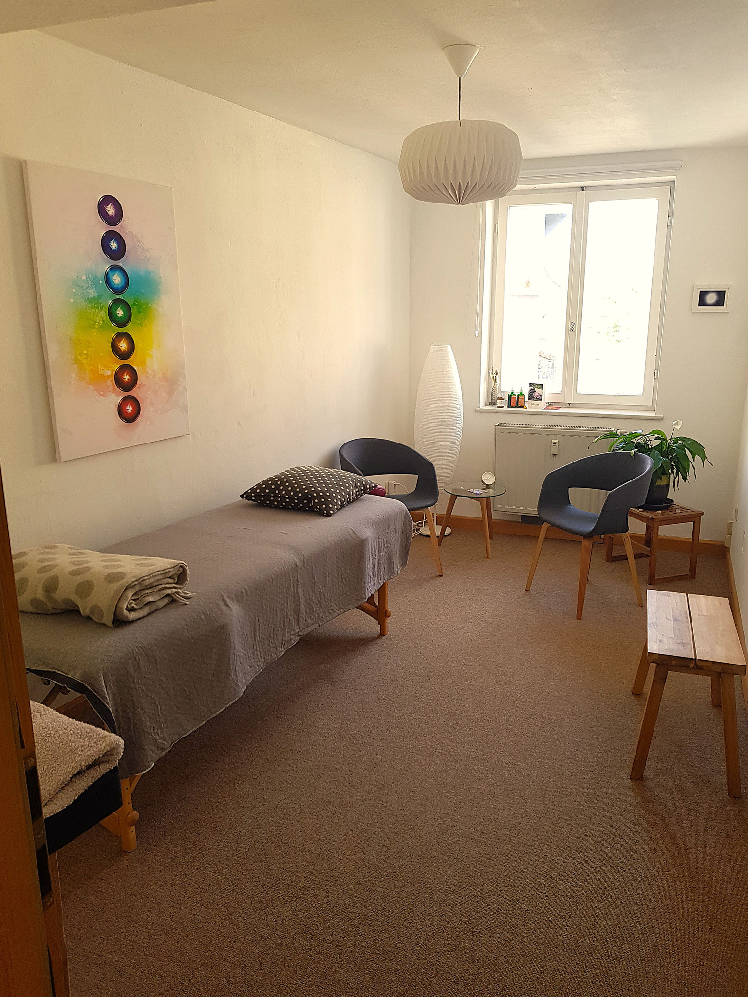Der 12 m² Behandlungsraum ist mit Streichputz und Teppichboden gestaltet und ist eingebettet in die Praxisgemeinschaft selbstständiger Therapeuten und Musiker ETAGE ZWEI im Zentrum von Müllheim.