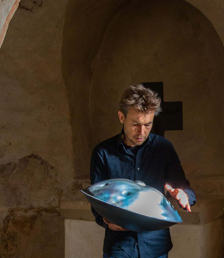 Auf vier Handpans verwebt er mehrstimmige Melodien mit Kraftvollen Gesängen zu seinem unverwechselbaren meditativen Stil: Man meint gleichzeitig Harfen und Tablas zu hören- Schamanen und Muezzine. So scheinen seine Stücke immer wieder anderen Kulturen zu entspringen- weit entlegen und doch ganz vertraut. Der magische Klang des neuen Instruments führt uns schon nach wenigen Momenten durch viele innere Bilder in einen weiten stillen inneren Raum.